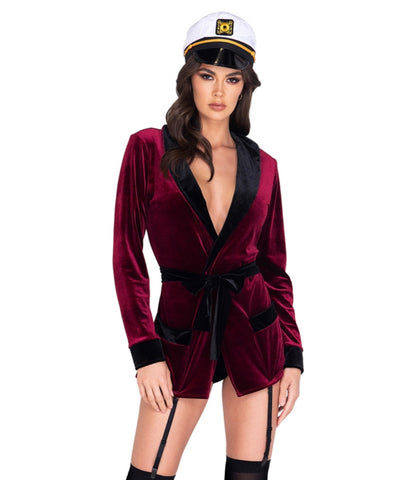 This set includes short velvet robe with garters and waist belt detail, and a sailor hat. Not included: thigh highs and shorts