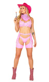 Includes: Vinyl Studded Bra Top with Fringe Detail, Bikini Bottom, Bandana, and Belted Chaps