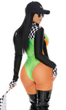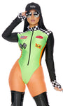 4pc. sexy racer costume features color block zipfront mockneck long sleeve bodysuit with checkerprint contrast, high-leg, matching gloves, neon fishnet pantyhose and aviator sunglasses.