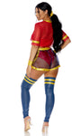 7pc. sexy soccer player costume features cropped jersey mesh tee with metallic gold accents and matching solid bandeau top and panty paired with shorts with tulip side hems and striped leg accessories along with wristlets and scrunchie.