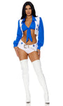 4-piece sexy cheerleader costume features collared tie-top with balloon sleeves paired with star embroidered fringe vest along with matching low-rise cheeky shorts and belt.