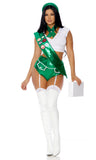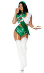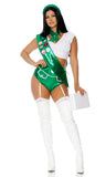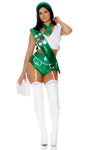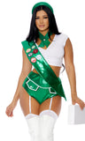 5pc. sexy girl scout costume includes ruched crop top paired with metallic panty with faux pocket detail and attached garter straps and includes matching necktie and crossbody sash with decorative patches and matching headband.