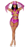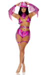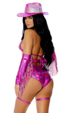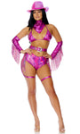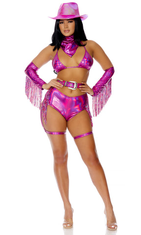 5pc. sexy cowgirl costume features metallic triangle top paired with matching vinyl fringe shorts including western buckle garter waist belt along with matching fringe sleeves and bandana.