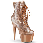 7" (178mm) Heel, 2 3/4" (70mm) Platform Lace-Up Front Ankle Boot w/ Reversible Sequins, Inner Side Zip Closure.