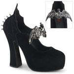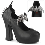 5" (127mm) Heel, 1 1/2" (38mm) Concealed Platform Slip-On Mary Jane Pump Featuring Elastic Strap w/ Large Metal Bat & Cone Spike Studded Bat Wing Detail on the Heel Cap.
