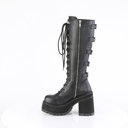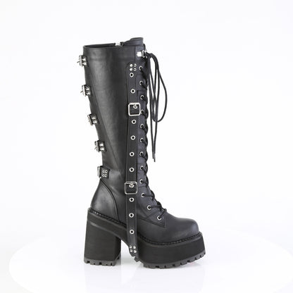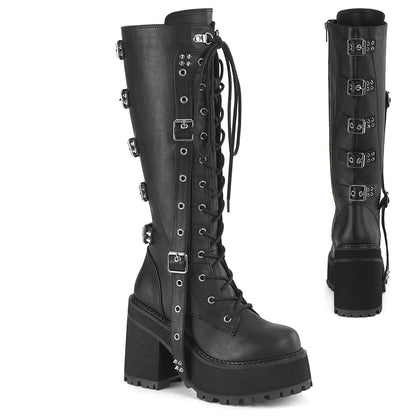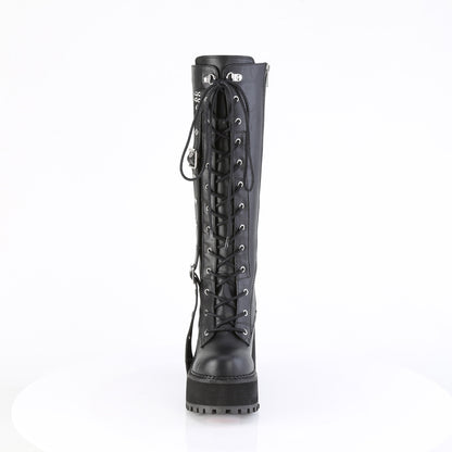 4 3/4" (121mm) Block Heel, 2 1/4" (57mm) Cleated Platform Lace-Up Front Knee High Boot Featuring Eyeletted & Cone Spike Studded Straight-Jacket Style Hanging Strap & Back Buckle Ornaments, Inside Metal Zip Closure