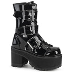 3 3/4" (95mm) Block Heel 2 1/4" (64mm) Platform Lace-Up Front Ankle Boot Featuring Triple Buckle Straps, Inner Side Metal Zip Closure.