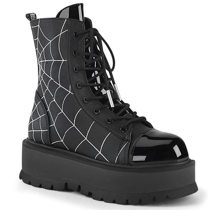 Conquer your fears and embrace the darkness with the SLACKER-88! This daring ankle boot features a 2" platform to elevate your style and a lace-up front for a secure fit. The embroidered spider web detail adds an edgy touch to any outfit. Defy expectations with the SLACKER-88, and take a step towards adventure!