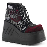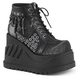 Take your style to new heights with the STOMP-18 lace-up front wedge bootie. Featuring a fishnet overlay on the vamp and dangling charms on the D-rings, this bold platform bootie will add a touch of adventure to any outfit. The non-functioning zip closure detail on the tongue and inner side metal zip make for easy on and off, making these boots perfect for a night of daring exploration.