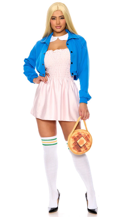 5-piece sexy TV show character costume features smocked dress and contrast cropped jacket paired with collar and socks and waffle print bag.