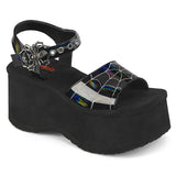 Step into spooky fun with the FUNN-10! These 2 1/2" platform sandals feature a playful silver-tone spider shaped buckle and spider web embroidered vamp. Get tangled up in style with the FUNN-10!