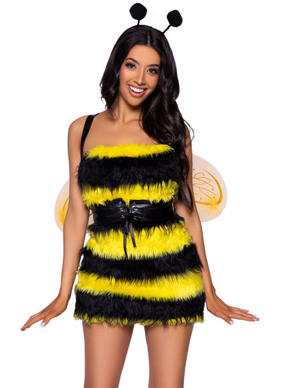 Cause a buzz around the beehive when you arrive in the ultra-cute Bizzy Bee costume by Leg Avenue. The bee-utiful 3 piece bumble bee costume features a furry striped mini dress, waist cincher wing harness, and adorable antennae headband. This easy Halloween costume pairs perfectly with tights or socks for a little added coverage.