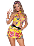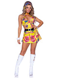 Step into the grooviest era in the far out Mod Chick costume by Leg Avenue. The 3 piece mod hippie costume features a 60s inspired printed halter cut-out dress, vinyl belt, and matching headband. This easy Halloween costume pairs perfectly with tights or thigh highs for an extra groovy look.