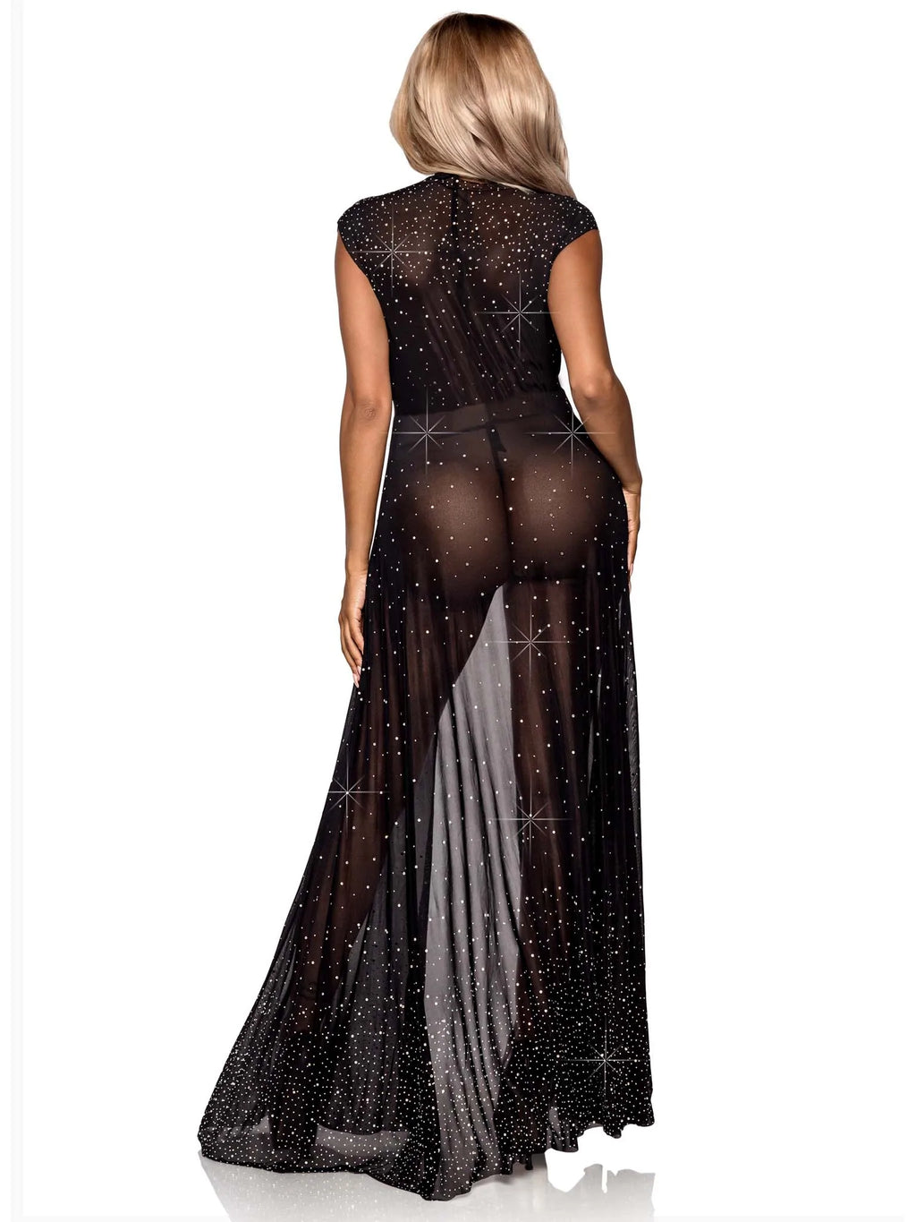 Feel and look like a goddess in this sheer black long lingerie robe studded with rhinestones from Leg Avenue. Its deep V neckline and ultra-high cut highlight your curves and create an irresistible intrigue. Covered in sparkling rhinestones from top to bottom, it's easy to create a glamorous look for after hours with this piece. Wear it alone or over your favorite lace lingerie set and complete your look with a pair of high heels. The flowing cut of this lingerie looks fabulous on all body types in sizes S to semi L.