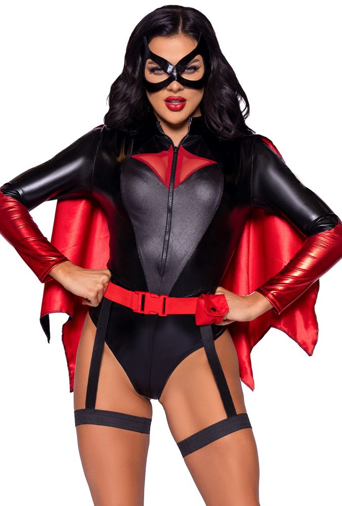 Clean up the streets of Gotham in style in the 4 piece Vigilante Vixen costume by Leg Avenue. Super hero costumes don’t get sexier than this sexy batgirl, featuring a long sleeves zip-up bodysuit, detachable cape, belt with attached garter, and eye mask. Partner up with a batman costume for a fun couples costume for Halloween.