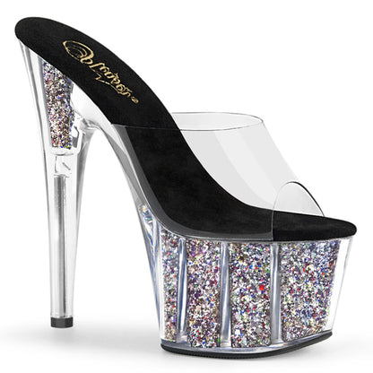 7" (178mm) Heel, 2 3/4" (70mm) Platform Slide w/ Confetti Glitter Inserts in the Platform Bottom.