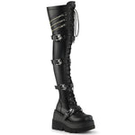 4 1/2" (114mm) Wedge Platform Front Lace-Up Stretch Thigh High Boot w/ Quadruple Skull Buckle Strap & Ornamental Zip Closure Details on the Outside , Full Inner Side Zip Closure.