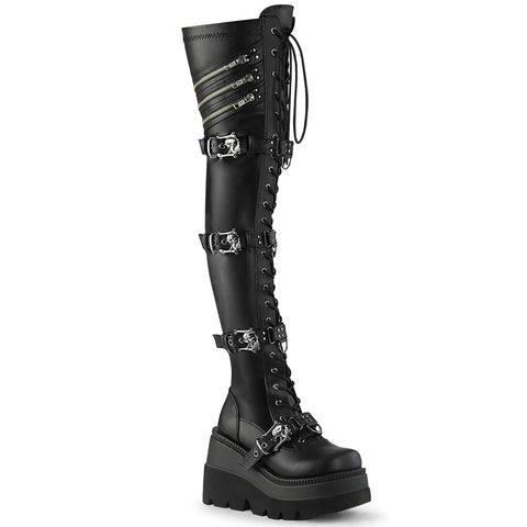 Take a daring step forward with the SHAKER-420! This 4 1/2" (114mm) wedge platform boot has a front lace-up design and stretch thigh-high fit for added comfort. The quadruple skull buckle strap and ornamental zip closure details add an edgy touch while the full inner side zip closure ensures easy wear. Unleash your fearless side with the SHAKER-420!